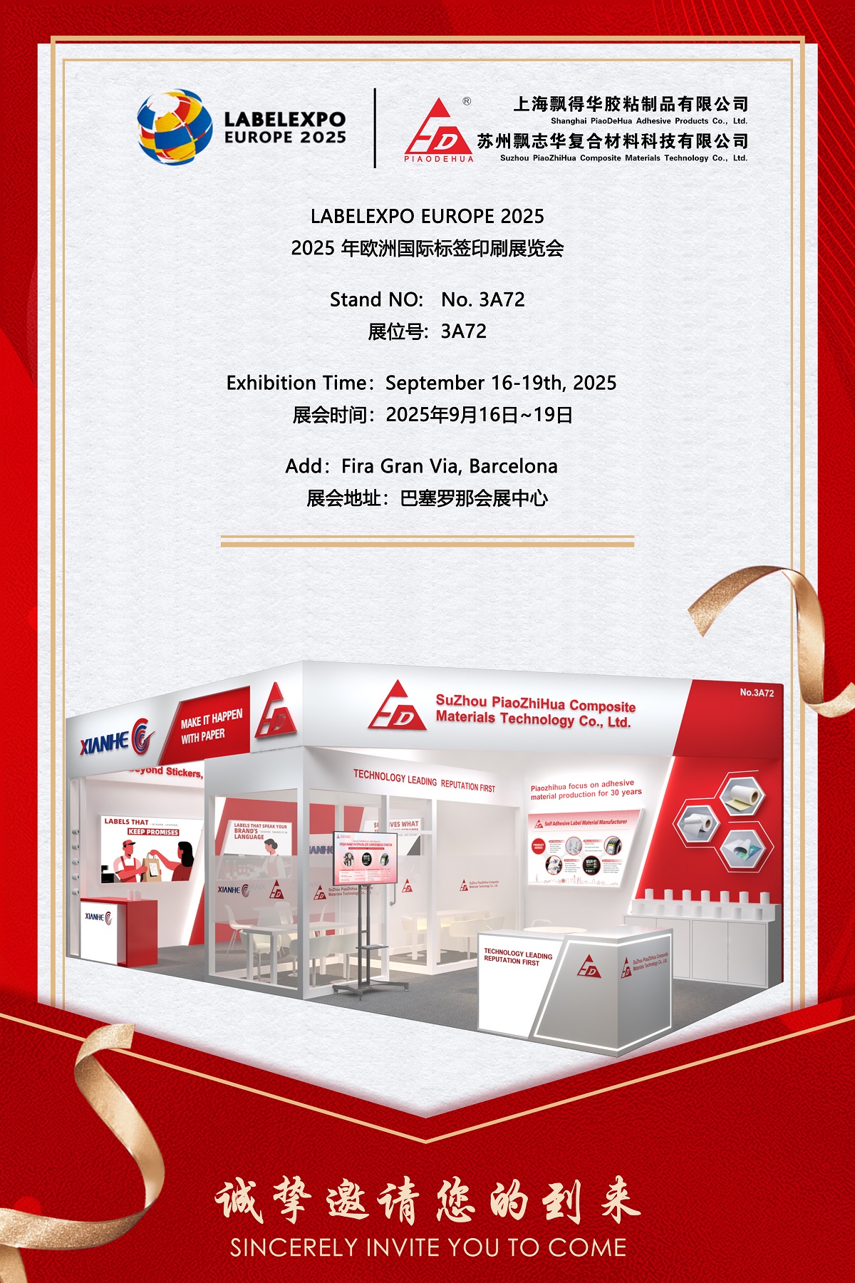 SuZhou PiaoZhiHua Composite Materials Technology Co., Ltd. se enorgullece de anunciar su participación en Labelexpo Europe 2025, la feria internacional líder en impresión de etiquetas y embalajes, que tendrá lugar del 16 al 19 de septiembre de 2025 en Fira Gran Via de Barcelona, España. Como fabricante confiable de materiales para etiquetas autoadhesivas de alto rendimiento con más de tres décadas de experiencia en la industria, Piaozhihua exhibirá su innovadora cartera de productos en el stand. N° 3A72 . La exposición contará con soluciones adhesivas avanzadas diseñadas para diversas aplicaciones en los sectores de bienes de consumo, logística e industria.